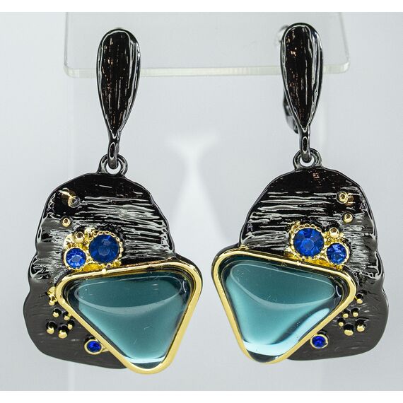 Серьги из гипоаллергенного ювелирного сплава черного и желтого цвета. Вставка- улексит ( кошачий глаз), цвет- голубой и ювелирное стекло, цвет- синий. Высота серег-4,5см, ширина-2,5см. Английский замок ( швенза-1,0см).