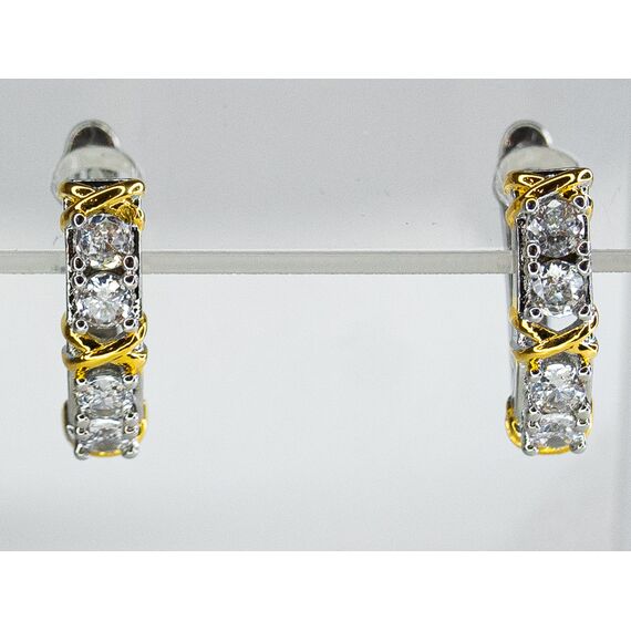 Серьги из гипоаллергенного ювелирного сплава желтого и серого цвета. Вставка- цирконы белого цвета. Высота серег- 1,5см, ширина-0,6см. Застежка- английская ( швенза-1,0см).