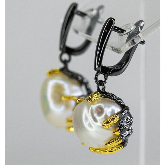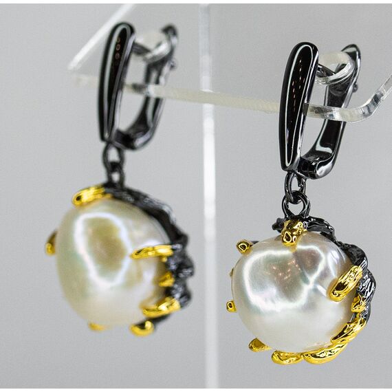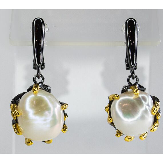 Серьги из гипоаллергенного ювелирного сплава черного и желтого цвета. Вставка- барочный жемчуг белого цвета (размер камня - 1,5см). Высота серег-3,0см, ширина-1,3см. Английский замок ( швенза-1,0см).
