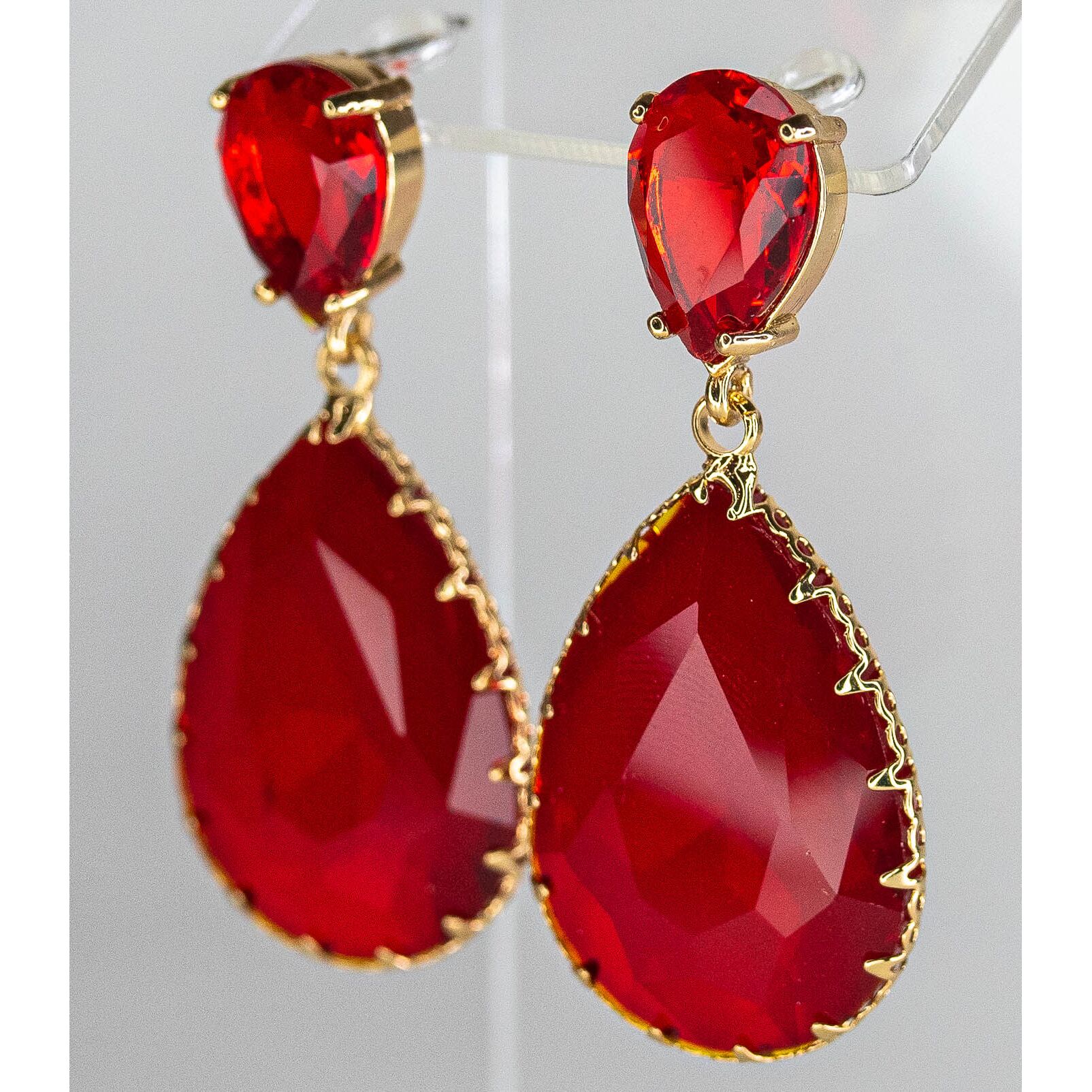 Серьги из гипоаллергенного ювелирного сплава желтого цвета. Вставка- ювелирное стекло красного цвета. Высота серег-4,5см, ширина-2,0см. Застежка- пусет.