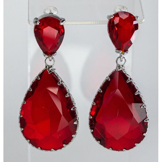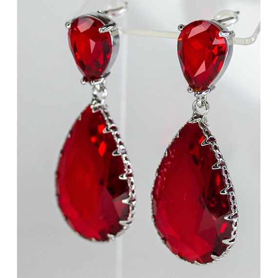 Серьги из гипоаллергенного ювелирного сплава серого цвета. Вставка- ювелирное стекло красного цвета. Высота серег-4,5см, ширина-2,0см. Застежка- пусет.