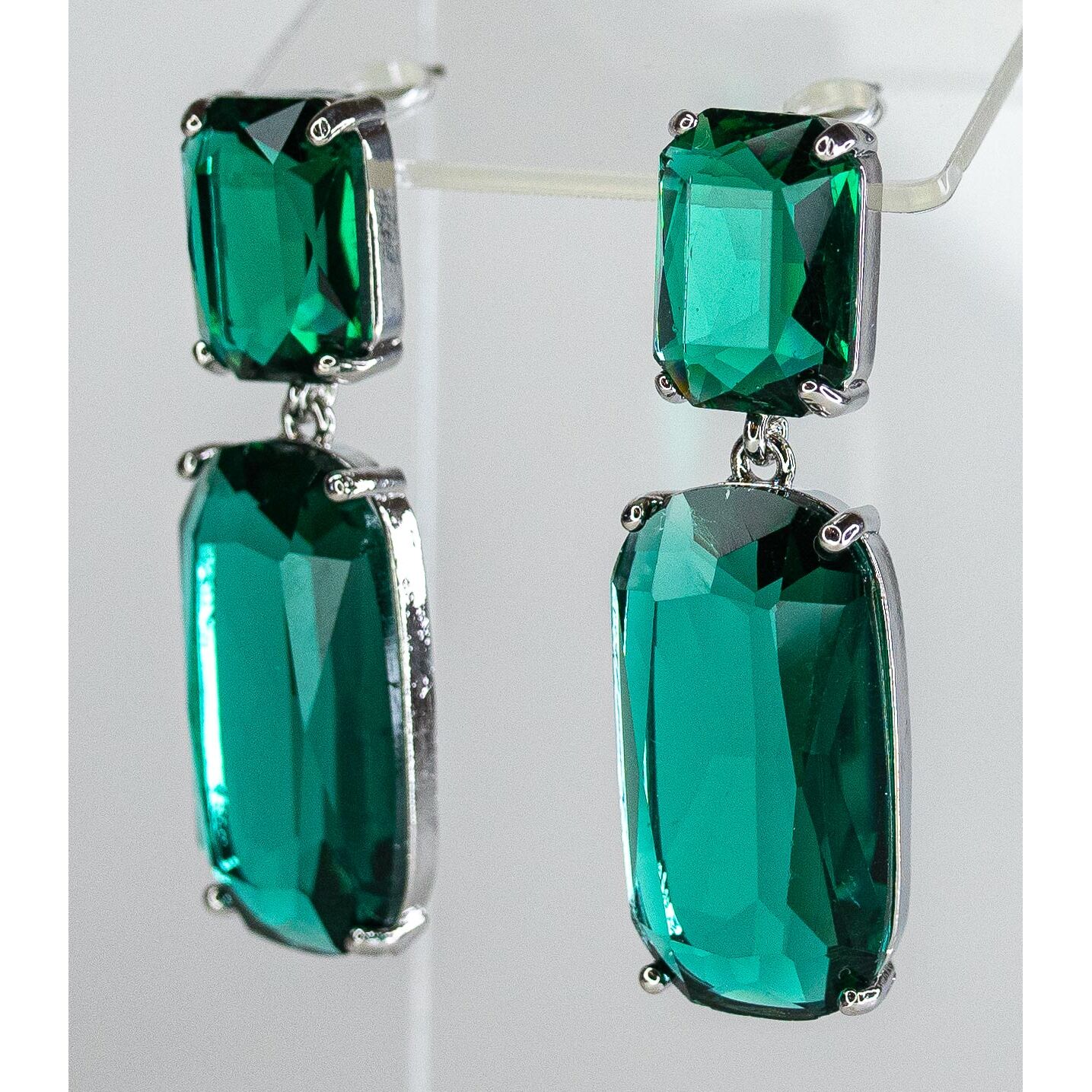Серьги из гипоаллергенного ювелирного сплава серого цвета. Вставка- ювелирное стекло зеленого цвета. Высота серег-4,0см, ширина-1,5см. Застежка- пусет.