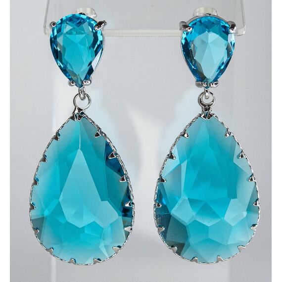Серьги из гипоаллергенного ювелирного сплава серого цвета. Вставка- ювелирное стекло голубого цвета. Высота серег-4,5см, ширина-2,0см. Застежка- пусет.
