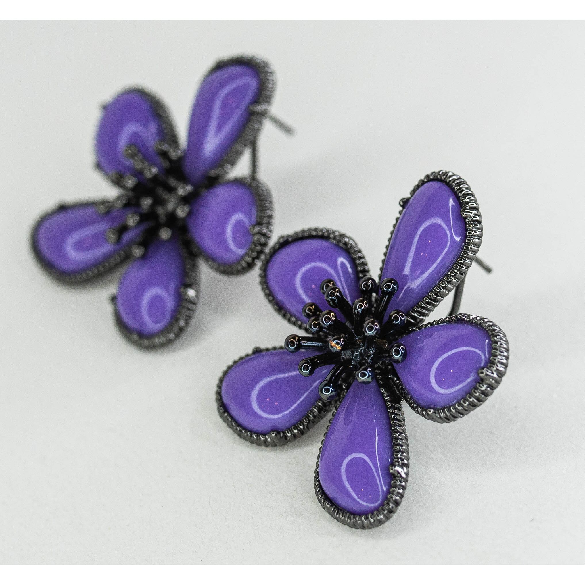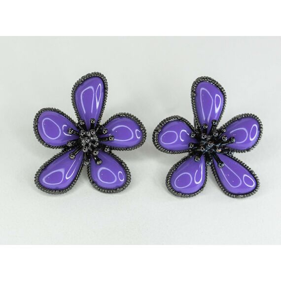 Серьги из гипоаллергенного ювелирного сплава черного цвета. Без вставок. Покрытие эмалью фиолетового цвета. Высота серег-3,0см, ширина-3,0см. Итальянский замок ( швенза-1,2см и застежка- клипса).