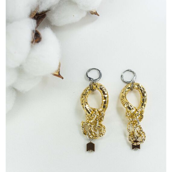 Серьги из гипоаллергенного ювелирного сплава желтого и серого цвета. Вставка- агат , цвет- коричневый. Высота серег- 7,5см. Застежка- скоба.
