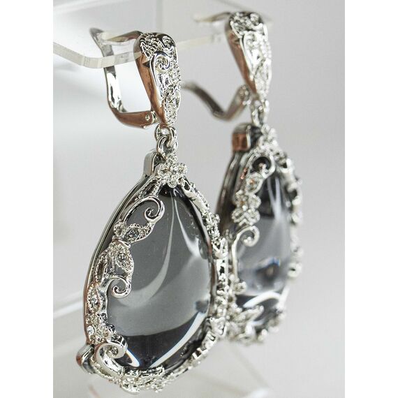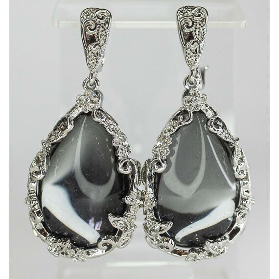 Серьги из гипоаллергенного ювелирного сплава серого цвета. Вставка- улексит ( кошачий глаз) серого цвета. Высота серег--4,5см, ширина-2,5см. Итальянский замок( швенза-1,2см и застежка- клипса).