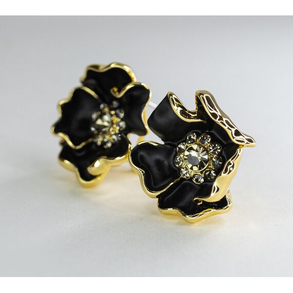 Серьги из гипоаллергенного ювелирного сплава желтого цвета. Вставка- ювелирное стекло серого цвета. Покрытие эмалью черного цвета. Высота серег--2,0см, ширина-2,0см. Итальянский замок (швенза-1,2см и застежка- клипса).