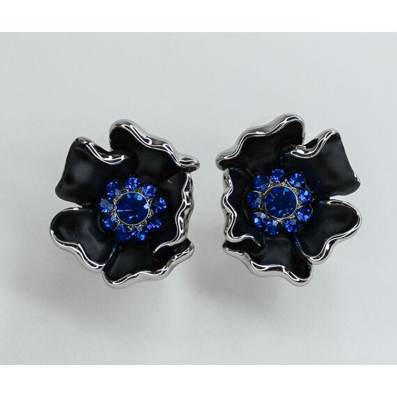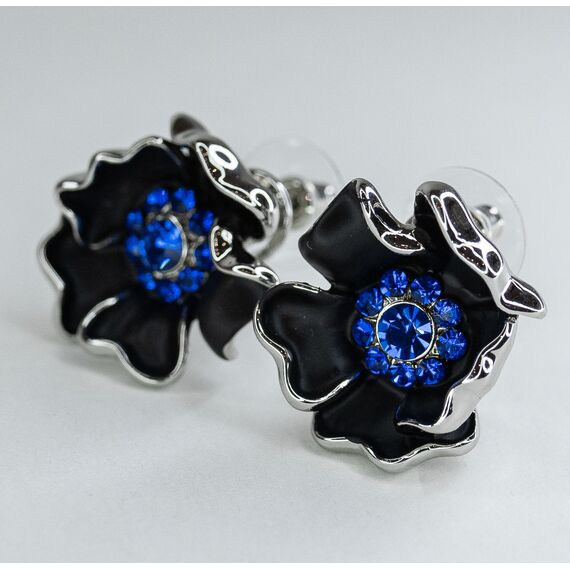 Серьги из гипоаллергенного ювелирного сплава серого цвета. Вставка- ювелирное стекло синего цвета. Покрытие эмалью черного цвета. Высота серег--2,0см, ширина-2,0см. Итальянский замок (швенза-1,2см и застежка- клипса).