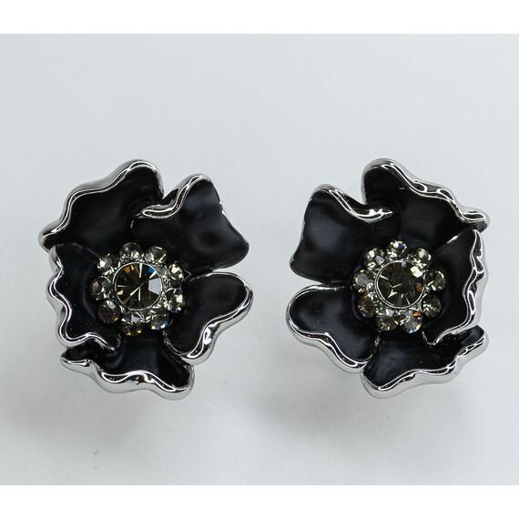 Серьги из гипоаллергенного ювелирного сплава серого цвета. Вставка- ювелирное стекло серого цвета. Покрытие эмалью черного цвета. Высота серег--2,0см, ширина-2,0см. Итальянский замок (швенза-1,2см и застежка- клипса).