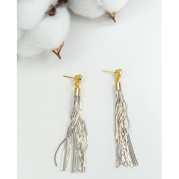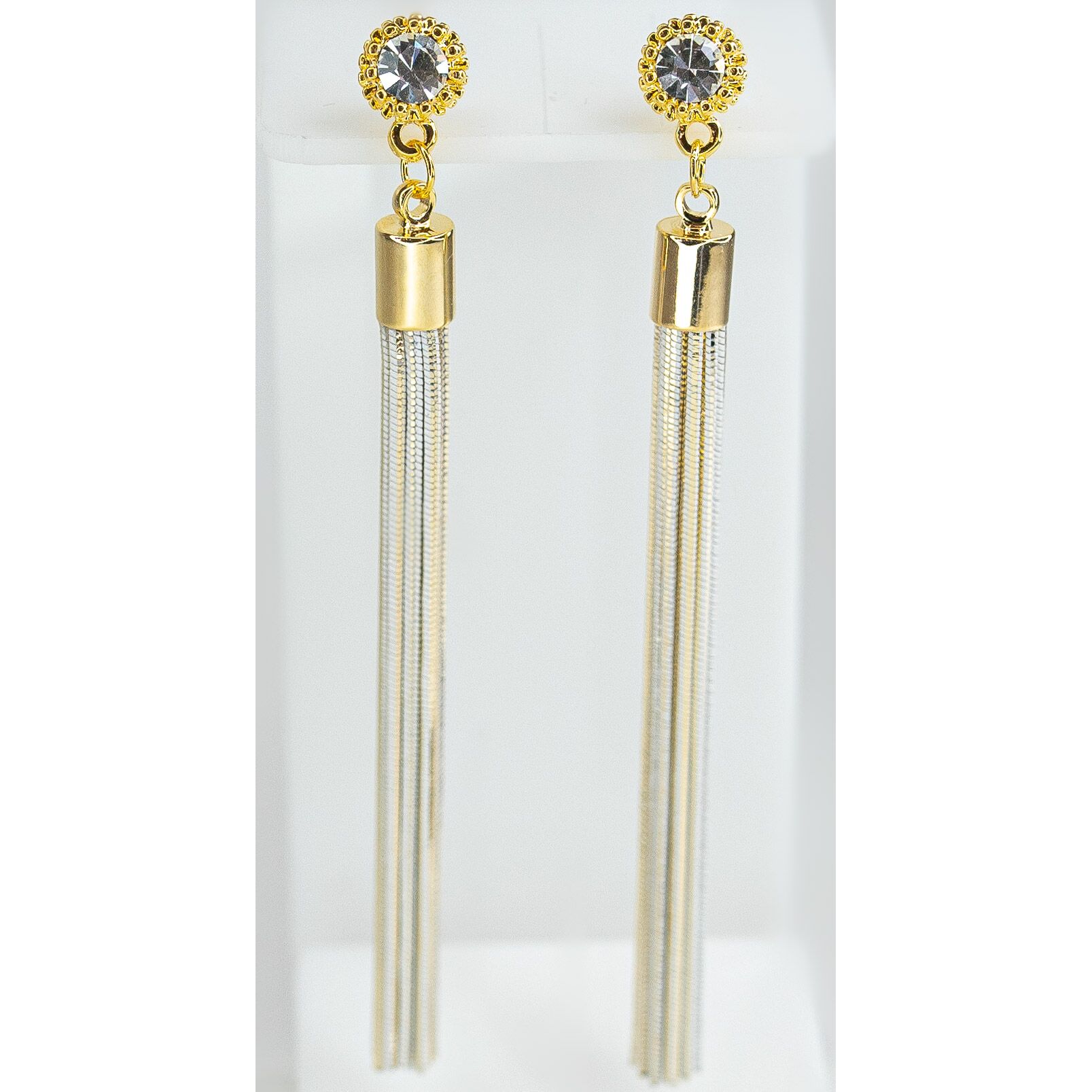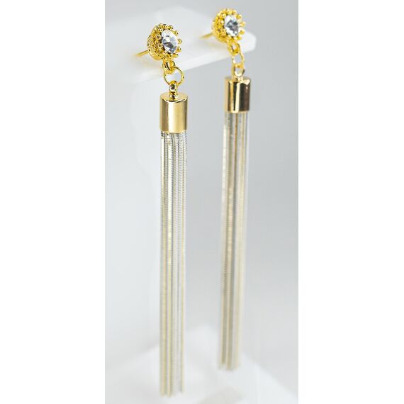 Серьги- цепочки из гипоаллергенного ювелирного сплава желтого цвета. Высота серег- 8,0см. Вставка- ювелирное стекло белого цвета. Серьги представляют собой каскад из тонких цепочек, покрытых напылением белой эмали, скрепленных в пучок- зажим. Застежка- пусет.