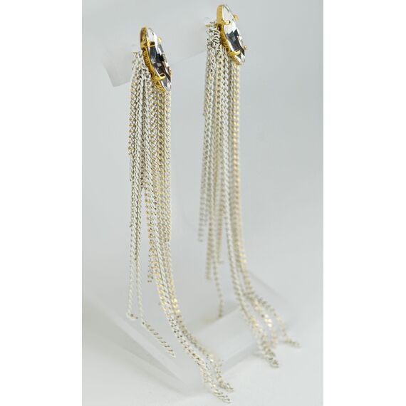 Серьги- цепочки из гипоаллергенного ювелирного сплава желтого цвета. Высота серег- 8,0см. Вставка- ювелирное стекло белого цвета. Серьги представляют собой каскад из тонких цепочек, покрытых напылением белой эмали, скрепленных в пучок- зажим. Застежка- пусет.