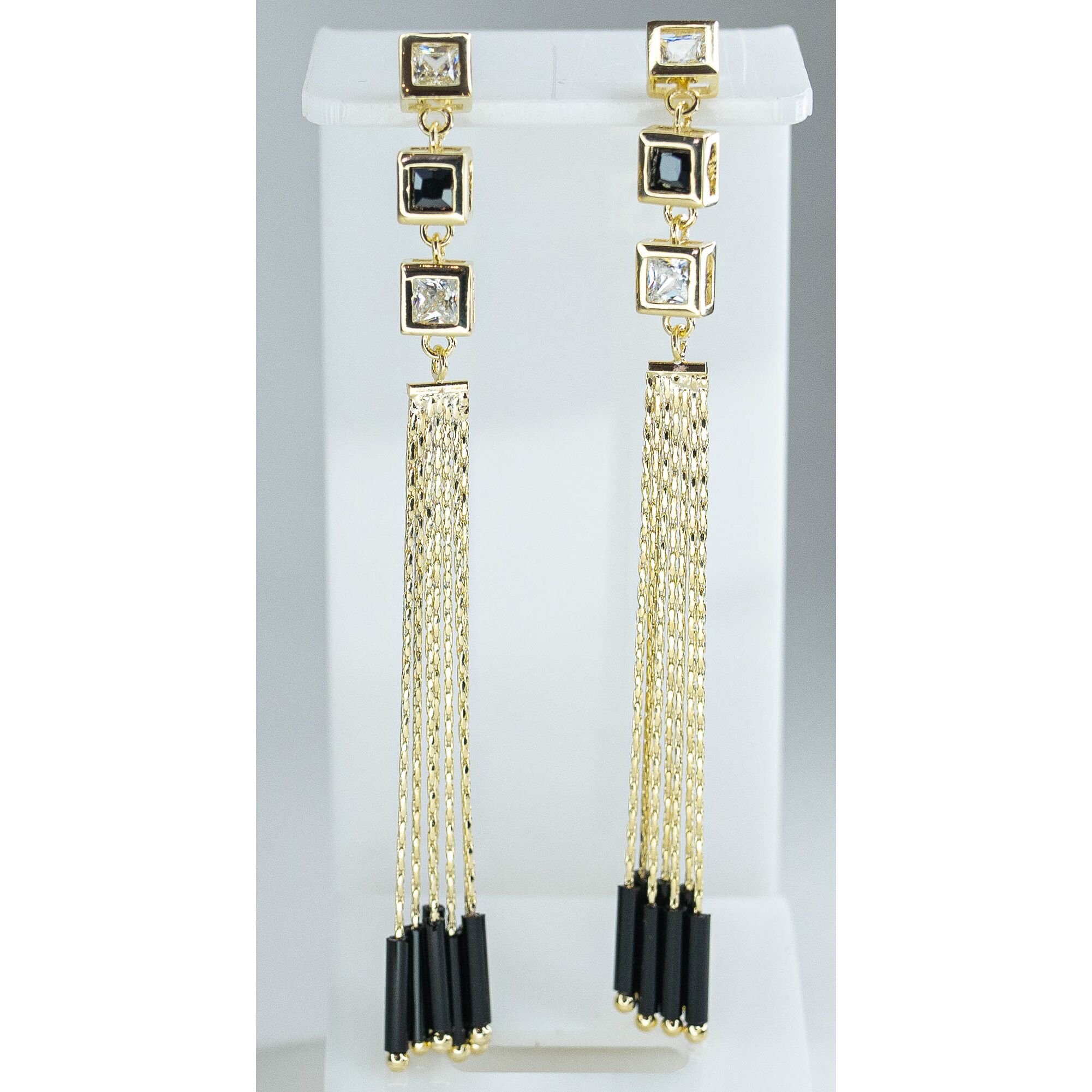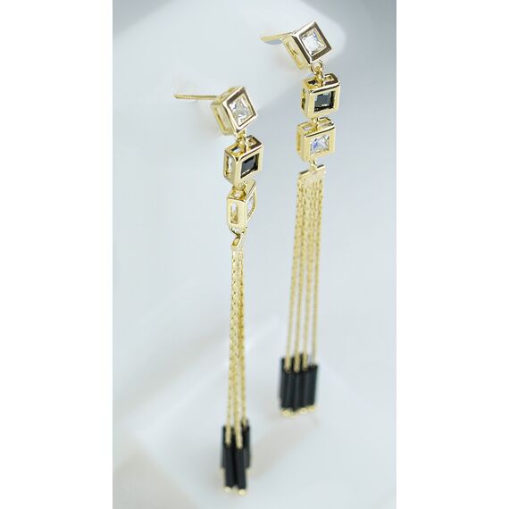 Серьги- цепочки из гипоаллергенного ювелирного сплава желтого цвета и пластика, цвет- черный. Высота серег- 8,0см. Вставка- ювелирное стекло белого и черного цвета. Серьги представляют собой каскад из цепочек, скрепленных в палочку- зажим. Застежка- пусет.