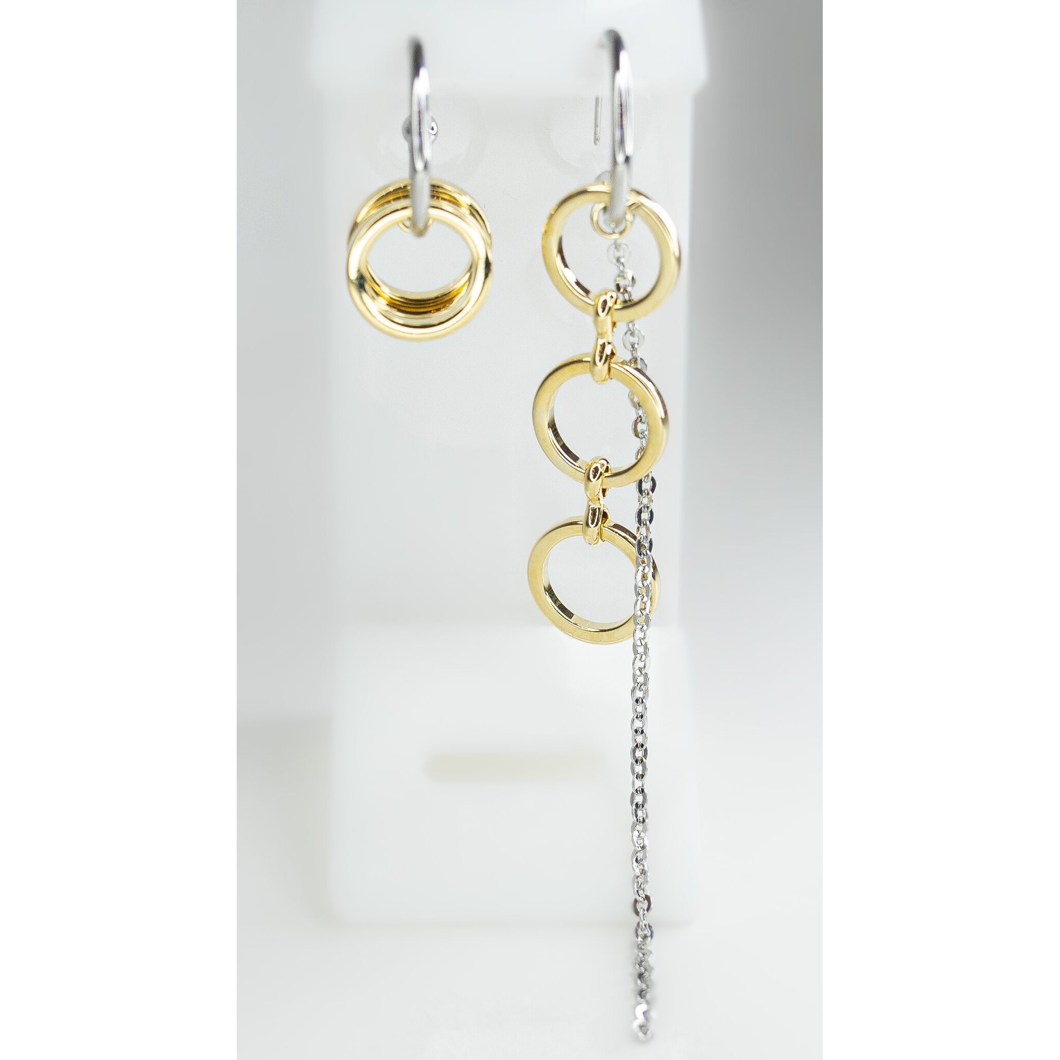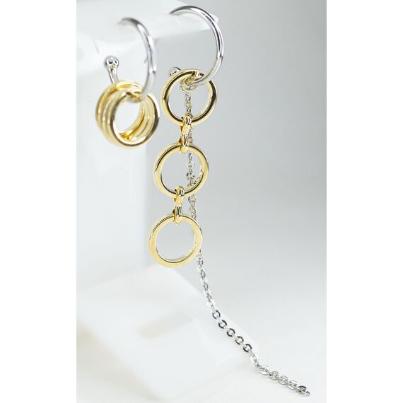 Серьги ( асимметрия) из гипоаллергенного ювелирного сплава серого и желтого цвета. Высота серег- 9,0см. Без вставок. Серьги состоят из набора колец и цепочки, являются непарными- асимметричными. Застежка- пусет.