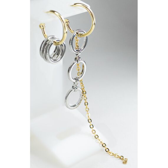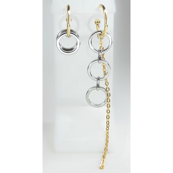 Серьги ( асимметрия) из гипоаллергенного ювелирного сплава серого и желтого цвета. Высота серег- 9,0см. Без вставок. Серьги состоят из набора колец и цепочки, являются непарными- асимметричными. Застежка- пусет.