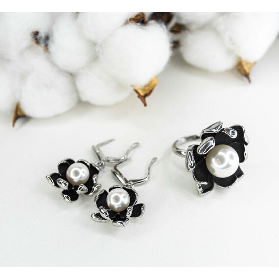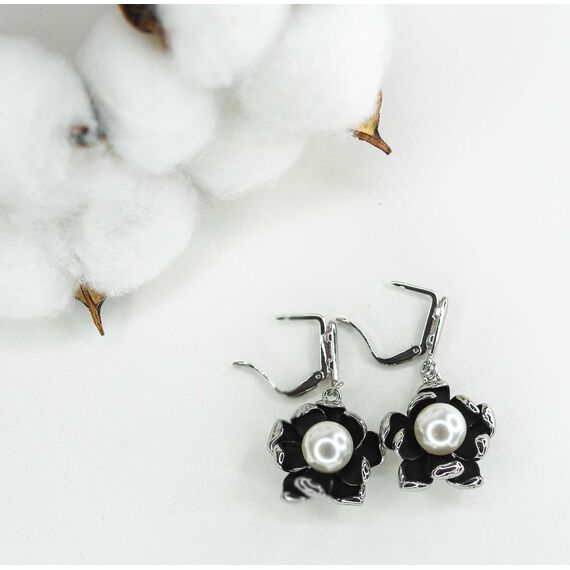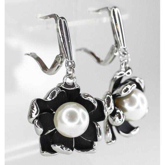 Серьги из гипоаллергенного ювелирного сплава серого и черного цвета. Высота серег- 4,0см, ширина-2,5см. Вставка- жемчуг иск. белого цвета. Английский замок ( швенза-1,0см).