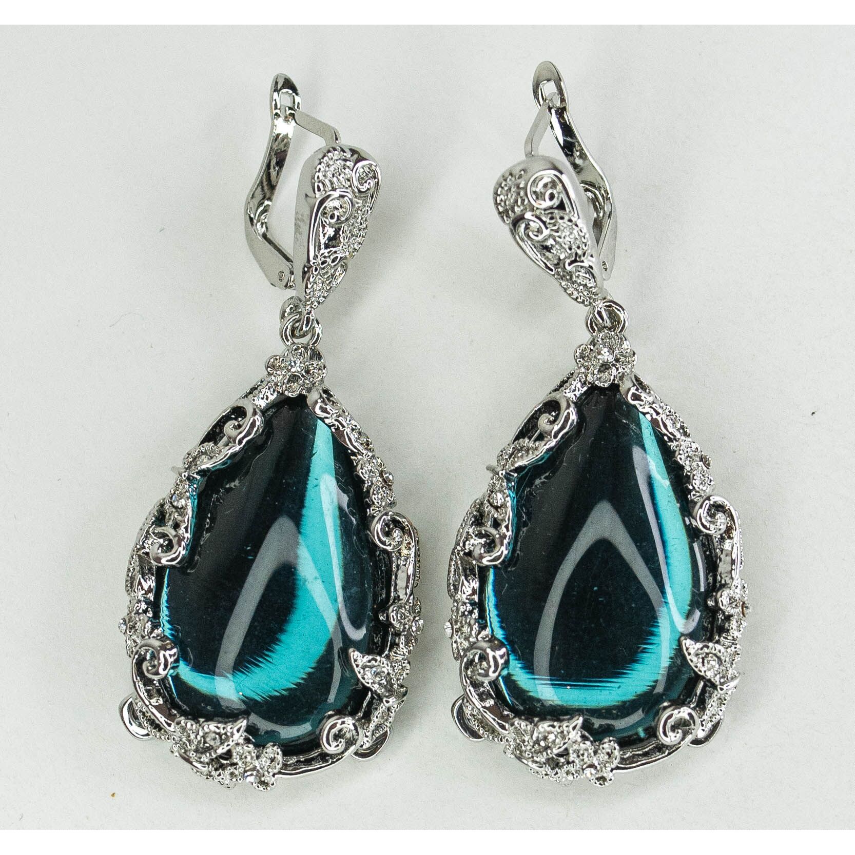 Серьги из гипоаллергенного ювелирного сплава серого цвета. Вставка- улексит ( кошачий глаз) синего цвета. Высота серег-5,0см, ширина-2,5см. Итальянская застежка ( швенза-1,2см и клипса).