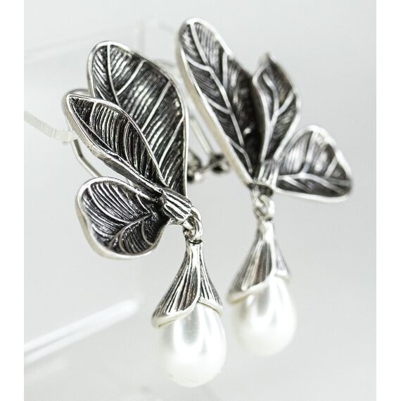 Серьги из гипоаллергенного ювелирного сплава серого цвета. Вставка- иск. жемчуг серого цвета. Высота серег-5,0см, ширина-2,5см. Итальянский замок (швенза-1,2см и застежка- клипса).