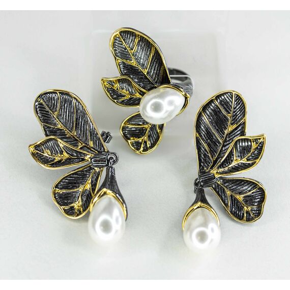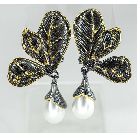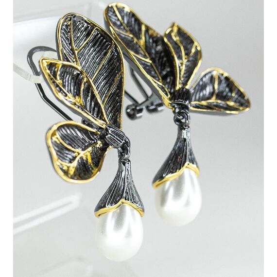 Серьги из гипоаллергенного ювелирного сплава черного и желтого цвета. Вставка- иск. жемчуг белого цвета. Высота серег-5,0см, ширина-2,5см. Итальянский замок (швенза-1,2см и застежка- клипса).