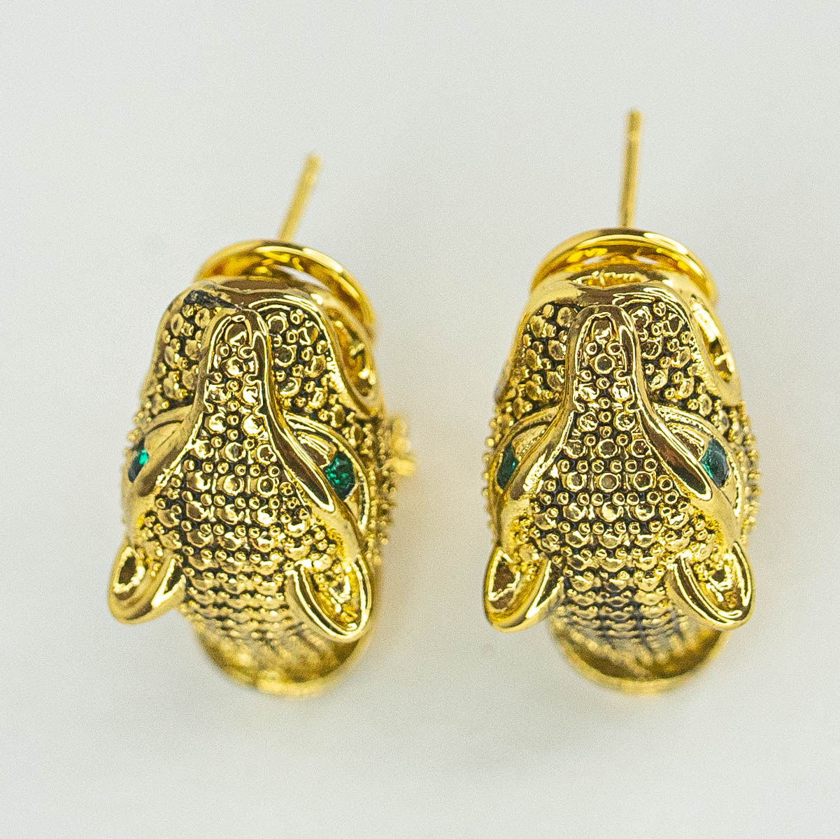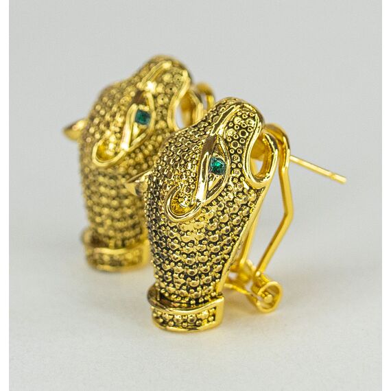 Серьги из гипоаллергенного ювелирного сплава желтого цвета. Вставка- ювелирное стекло, цвет- зеленый. Высота серег-3,0см, ширина-1,5см. Итальянский замок (швенза-1,2см и застежка- клипса).