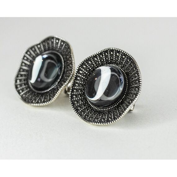 Серьги из гипоаллергенного ювелирного сплава серого цвета. Вставка- улексит ( кошачий глаз), цвет- серый. Высота серег-3,0см, ширина-3,0см. Итальянский замок (швенза-1,2см и застежка- клипса).