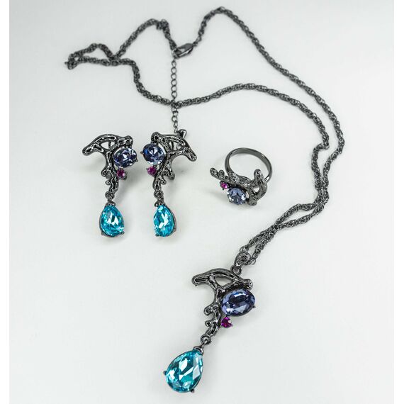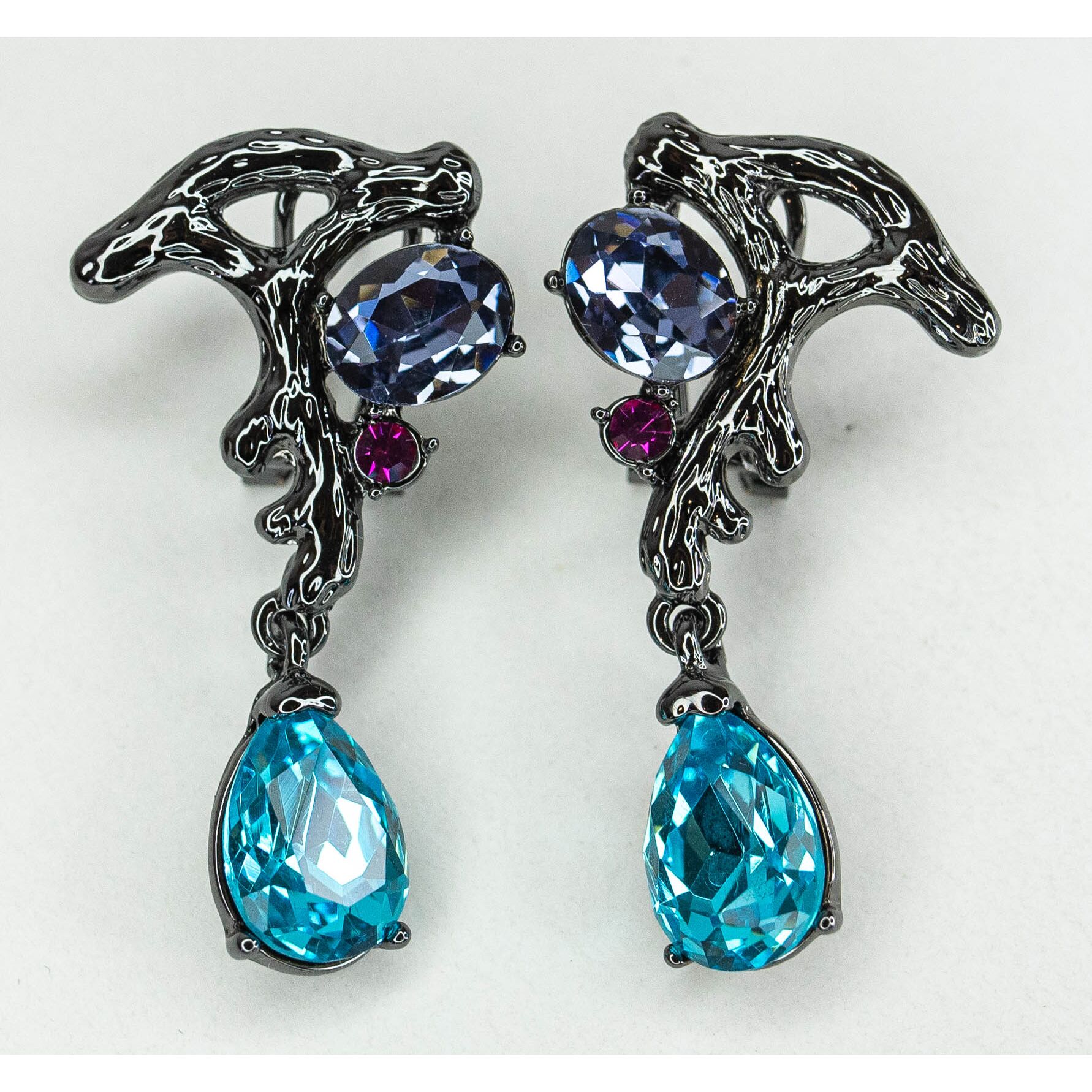 Серьги из гипоаллергенного ювелирного сплава черного цвета. Вставка- ювелирное стекло, цвет- голубой, розовый, сиреневый. Высота серег-5,0см, ширина-2,0см. Итальянский замок (швенза-1,2см и застежка- клипса).