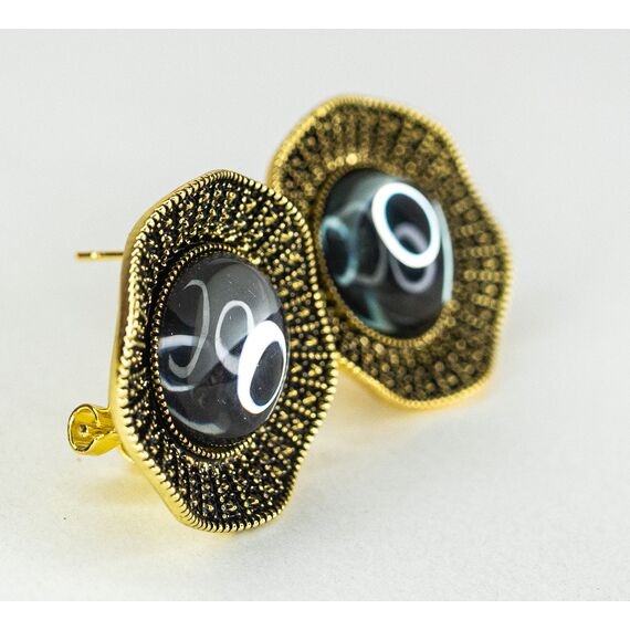 Серьги из гипоаллергенного ювелирного сплава желтого и черного цвета. Вставка- улексит (кошачий глаз) , цвет- серый. Высота серег-3,0см, ширина-3,0см. Итальянский замок (швенза-1,2см и застежка- клипса).