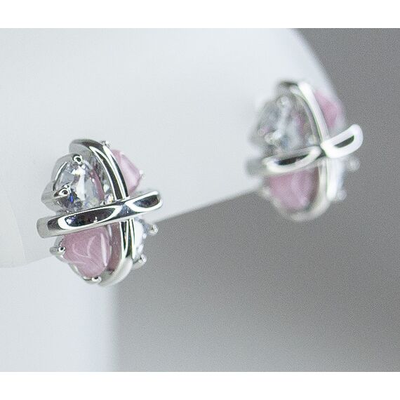 Серьги из гипоаллергенного ювелирного сплава, цвет- серый. Вставка- ювелирное стекло розового и белого цвета. Высота серег-1,0см, ширина-1,0см. Застежка- пусет.