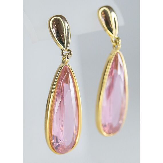 Серьги висячие из гипоаллергенного ювелирного сплава желтого цвета. Вставка- ювелирное стекло, цвет- розовый. Высота серег-5,0см, ширина-1,2см. Застежка- пусет.