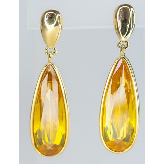 Серьги висячие из гипоаллергенного ювелирного сплава желтого цвета. Вставка- ювелирное стекло, цвет- желтый. Высота серег-5,0см, ширина-1,2см. Застежка- пусет.