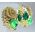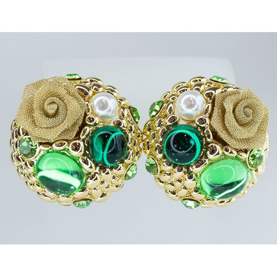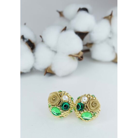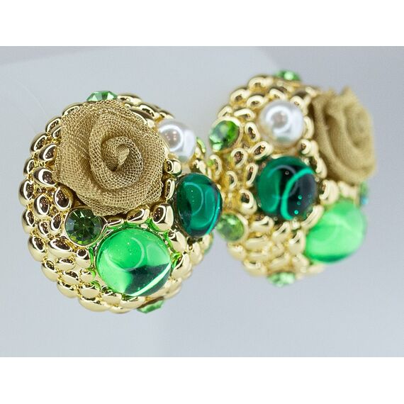 Серьги из гипоаллергенного ювелирного сплава желтого цвета. Вставка- эпоксидная смола, цвет- зеленый и иск. жемчуг белого цвета. Высота серег-3,0см, ширина-3,0см. Итальянский замок (швенза-1,2см и застежка- клипса).