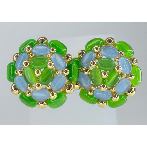 Серьги из гипоаллергенного ювелирного сплава желтого цвета. Вставка- улексит( кошачий глаз) зеленого и голубого цвета. Высота серег-3,0см, ширина-3,0см. Итальянский замок (швенза-1,2см и застежка- клипса).