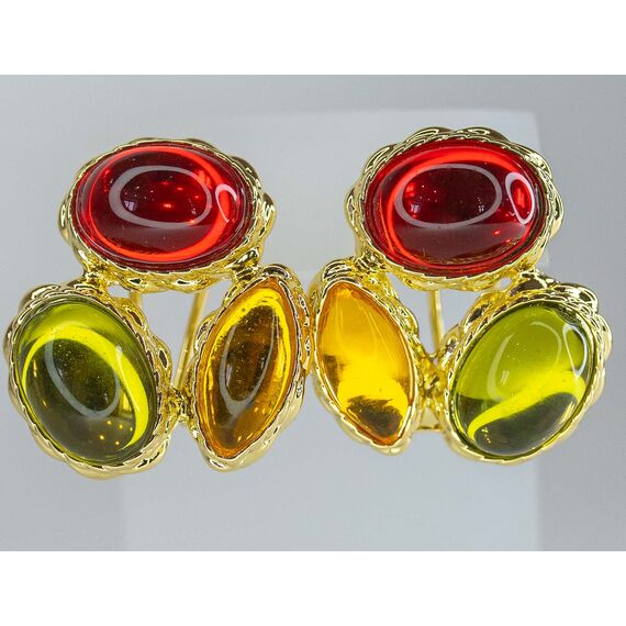 Серьги из гипоаллергенного ювелирного сплава желтого цвета. Вставка- эпоксидная смола, цвет- красный, желтый, зеленый. Высота серег-3,0см, ширина-3,0см. Итальянский замок ( швенза-1,2см и застежка- клипса).