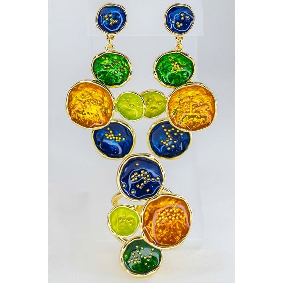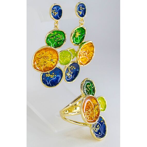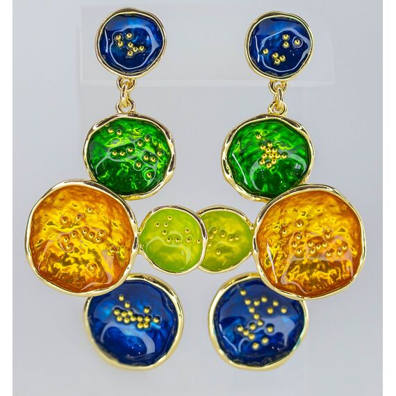Серьги из гипоаллергенного ювелирного сплава желтого цвета. Покрытие эмалью, цвет- желтый, зеленый, синий. Высота серег-5,0см, ширина-3,0см. Застежка- пусет.