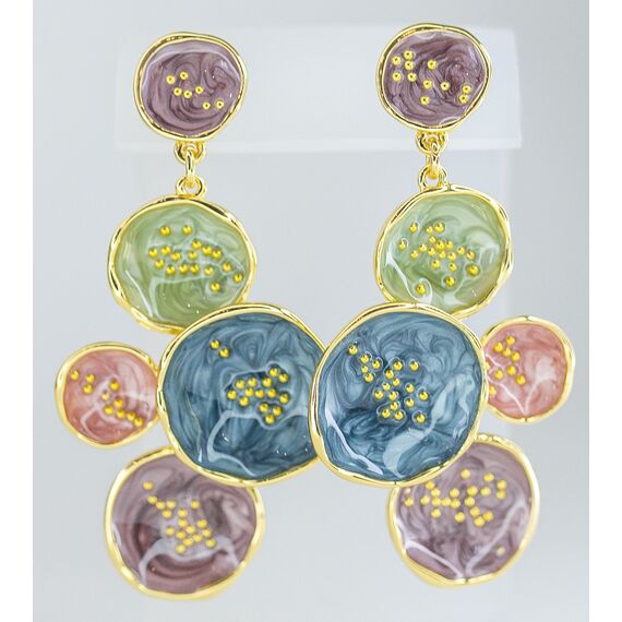Серьги из гипоаллергенного ювелирного сплава желтого цвета. Покрытие эмалью, цвет- розовый, синий, фиолетовый. Высота серег-5,0см, ширина-3,0см. Застежка- пусет.