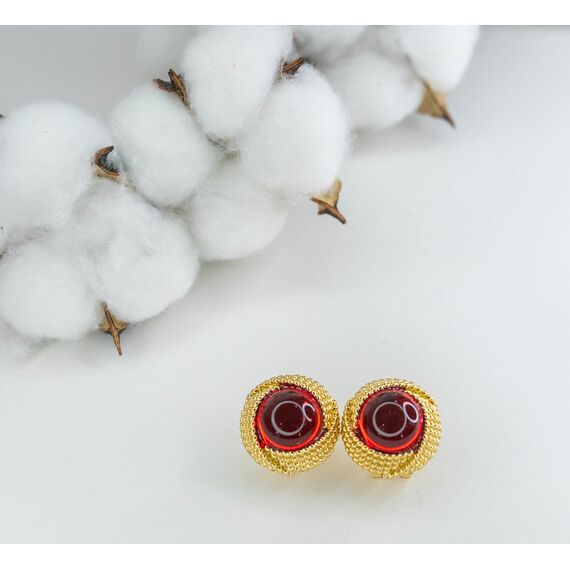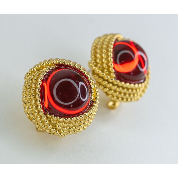 Серьги из гипоаллергенного ювелирного сплава желтого цвета. Вставка- эпоксидная смола, цвет- красный. Высота серег-2,0см, ширина-2,0см. Застежка- итальянская (швенза-1,2см и клипса).