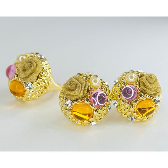 Серьги из гипоаллергенного ювелирного сплава желтого цвета. Вставка- эпоксидная смола, цвет- розовый, желтый и иск. жемчуг белого цвета. Высота серег-3,0см, ширина-3,0см. Итальянский замок (швенза-1,2см и застежка- клипса).