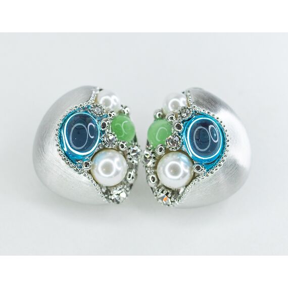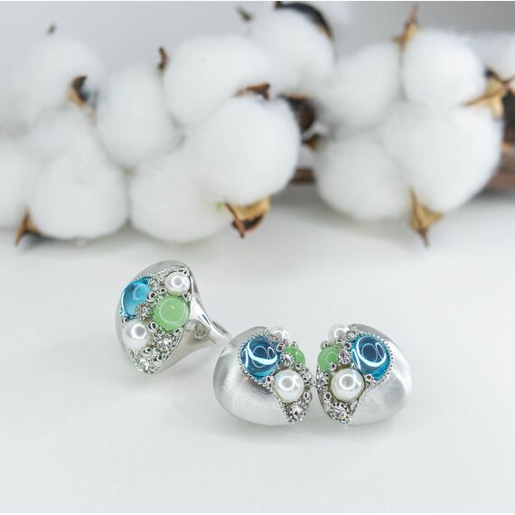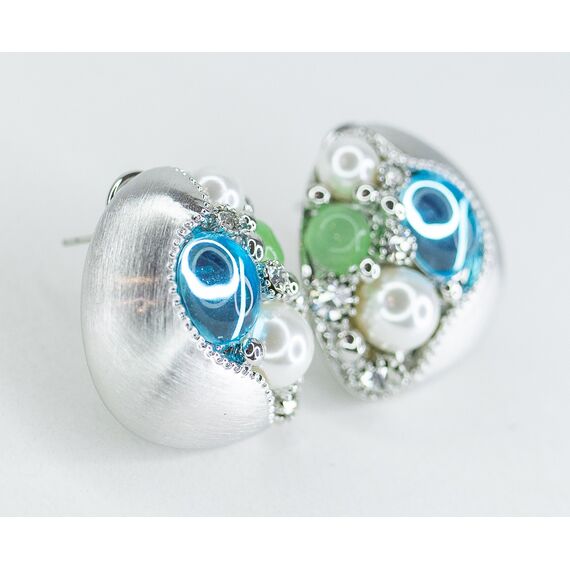 Серьги из гипоаллергенного ювелирного сплава серого цвета. Вставка- эпоксидная смола, цвет- зеленый, голубой и иск. жемчуг белого цвета. Высота серег-3,0см, ширина-3,0см. Итальянский замок (швенза-1,2см и застежка- клипса).
