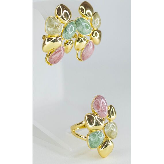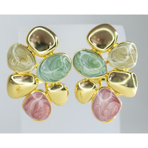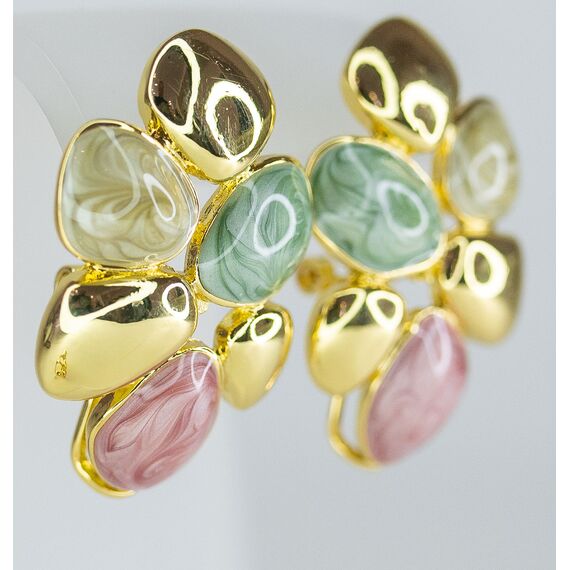 Серьги из гипоаллергенного ювелирного сплава желтого цвета. Покрытие эмалью, цвет- розовый, зеленый. Высота серег-4,0см, ширина-2,5см. Итальянский замок (швенза-1,2см и застежка- клипса).