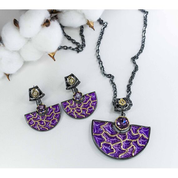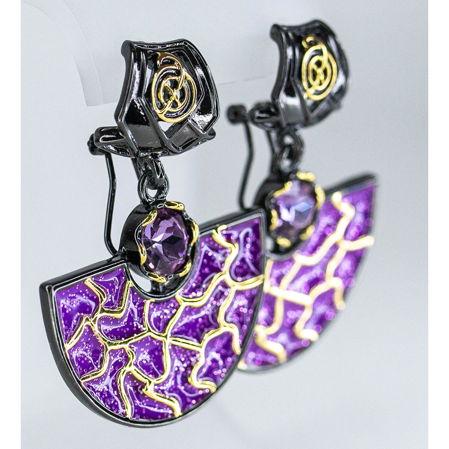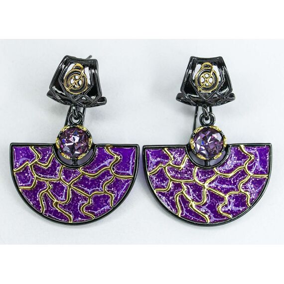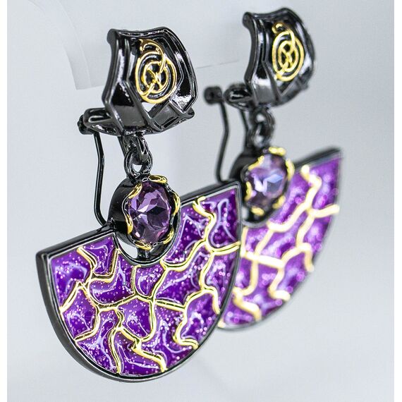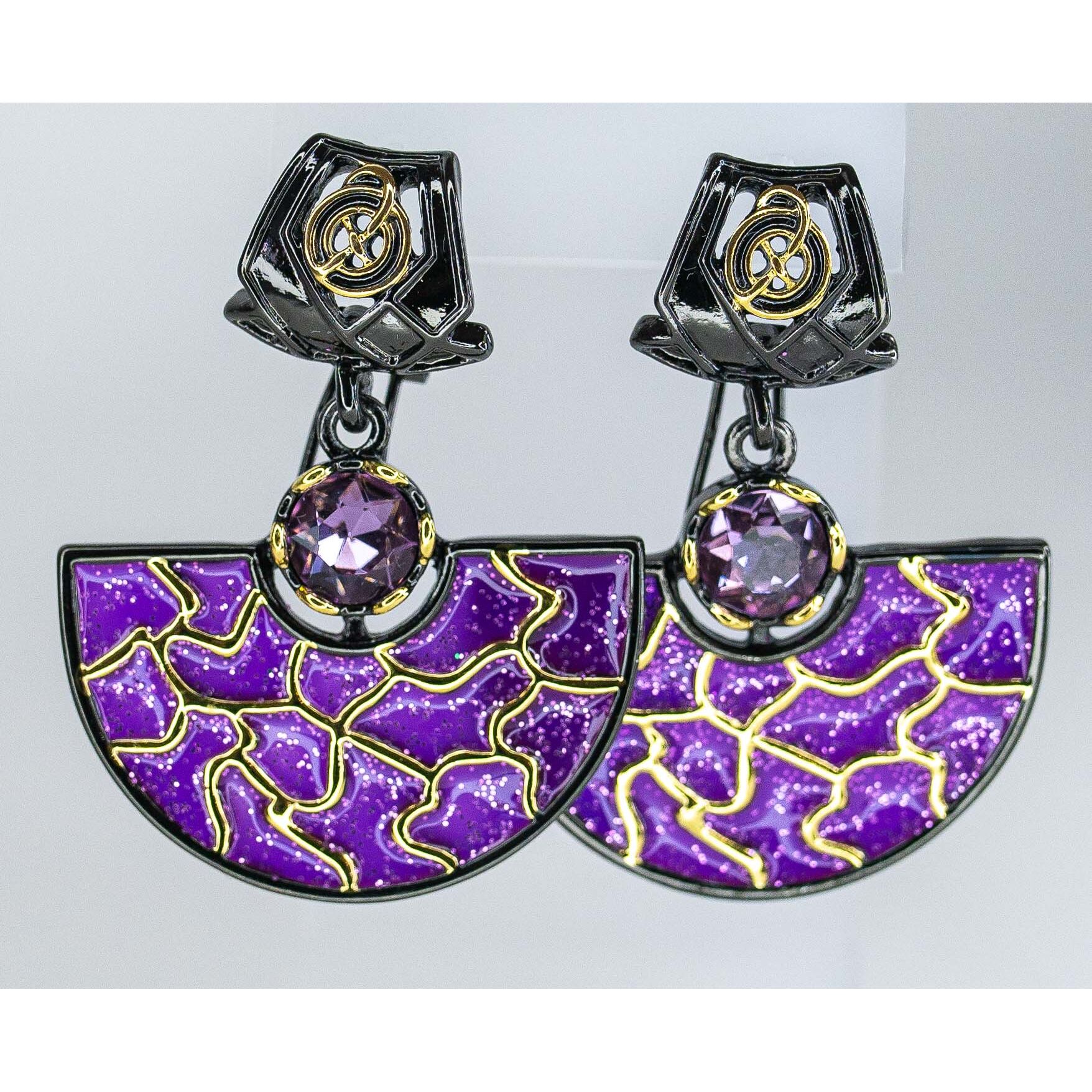 Серьги из гипоаллергенного ювелирного сплава черного и желтого цвета со вставкой из ювелирного стекла сиреневого цвета. Покрытие эмалью сиреневого цвета. Высота серег--4,0см, ширина-3,0см. Итальянский замок (швенза-1,2см и застежка- клипса).