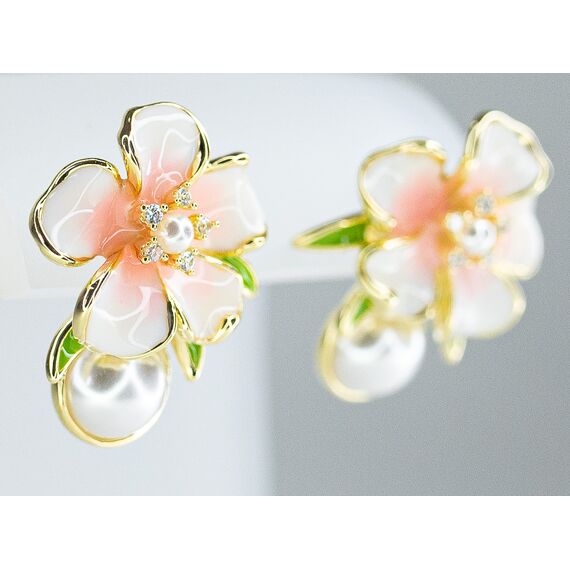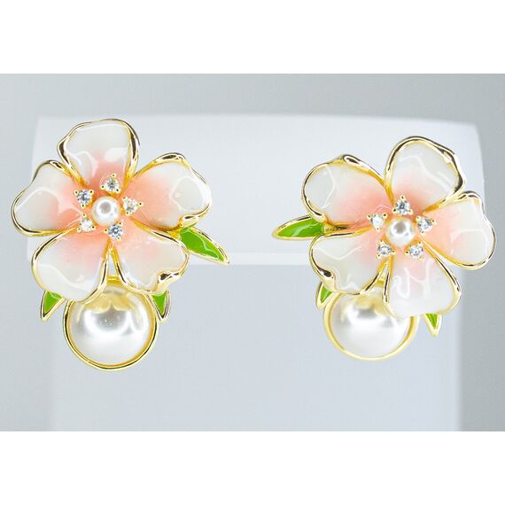 Серьги из гипоаллергенного ювелирного сплава, цвет-желтый.Вставка- иск. жемчуг белого цвета. Покрытие эмалью белого, розового, зеленого цвета. Высота серег-2,0см, ширина-2,5см. Застежка-пусет.