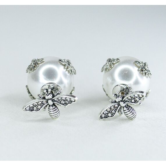 Серьги из гипоаллергенного ювелирного сплава, цвет- серый. Вставка- жемчуг иск. белого цвета. Высота серег-3,0см, ширина-1,5см. Застежка-пусет.