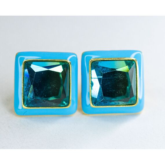 Серьги из гипоаллергенного ювелирного сплава желтого цвета. Покрытие эмалью, цвет- голубой. Вставка- кварц зеленого цвета. Высота серег- 2,0см, ширина- 2,0см. Итальянский замок (швенза-1,2см и застежка- клипса).