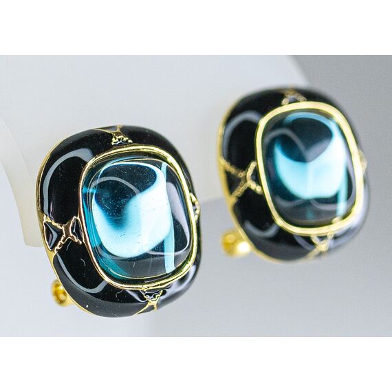 Серьги из гипоаллергенного ювелирного сплава желтого цвета. Покрытие эмалью, цвет- черный. Вставка- улексит (кошачий глаз) синего цвета. Высота серег- 2,0см, ширина- 2,0см. Итальянский замок (швенза-1,2см и застежка- клипса).