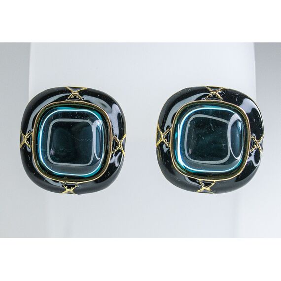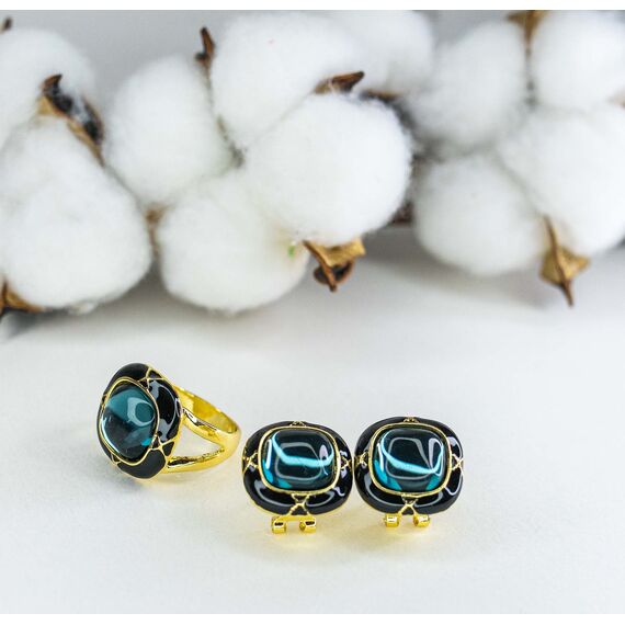 Серьги из гипоаллергенного ювелирного сплава желтого цвета. Покрытие эмалью, цвет- черный. Вставка- улексит (кошачий глаз) синего цвета. Высота серег- 2,0см, ширина- 2,0см. Итальянский замок (швенза-1,2см и застежка- клипса).