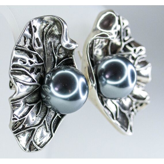 Серьги из гипоаллергенного ювелирного сплава серого цвета. Вставка- жемчуг иск. серого цвета. Высота серег- 4,0см, ширина- 2,5см. Итальянский замок (швенза-1,2см и застежка- клипса).