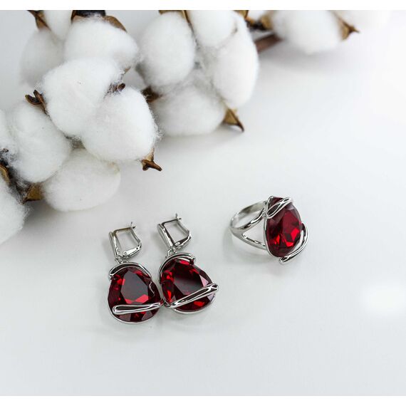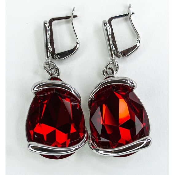 Серьги из гипоаллергенного ювелирного сплава серого цвета. Вставка- ювелирное стекло красного цвета. Высота серег- 4,0см, ширина- 1,5см. Английский замок (швенза-1,0см).