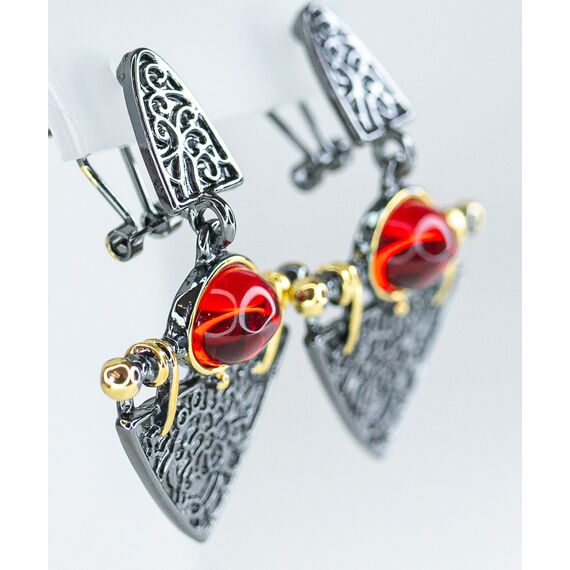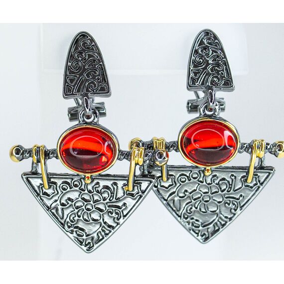 Серьги из гипоаллергенного ювелирного сплава серого и желтого цвета. Вставка- кварц красного цвета. Высота серег-4,0см, ширина-2,5см. Итальянский замок (швенза-1,2см и застежка- клипса).