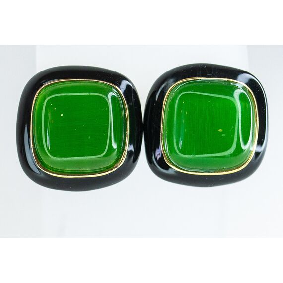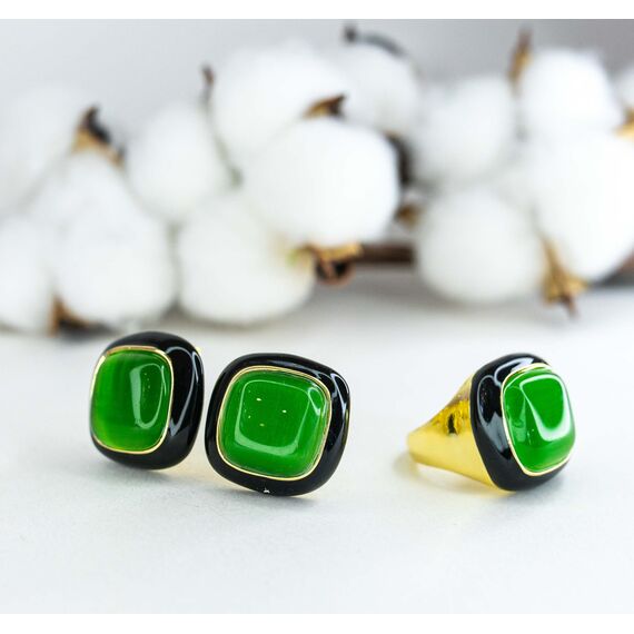 Серьги из гипоаллергенного ювелирного сплава желтого цвета. Вставка- улексит (кошачий глаз) зеленого цвета. Покрытие эмалью, цвет-черный. Высота серег-2,0см, ширина-2,0см. Итальянский замок (швенза-1,2см и застежка- клипса).
