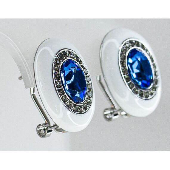 Серьги из гипоаллергенного ювелирного сплава серого цвета. Вставка- ювелирное стекло, цвет- белый, сиреневый. Покрытие эмалью, цвет-белый. Высота серег-2,0см, ширина-1,5см. Итальянский замок (швенза-1,2см и застежка- клипса).