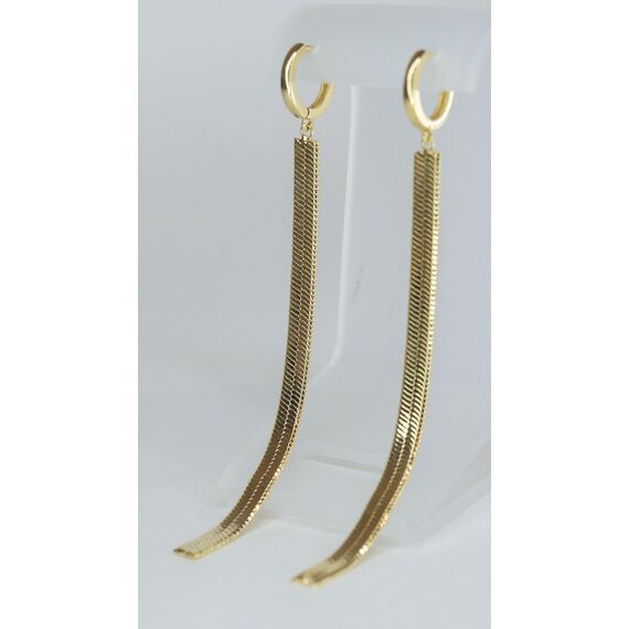 Серьги из гипоаллергенного ювелирного сплава желтого цвета, без вставок. Высота серег-7,0см. Серьги представляют собой цепочки, скрепленные у основания застежки. Застежка- скоба.